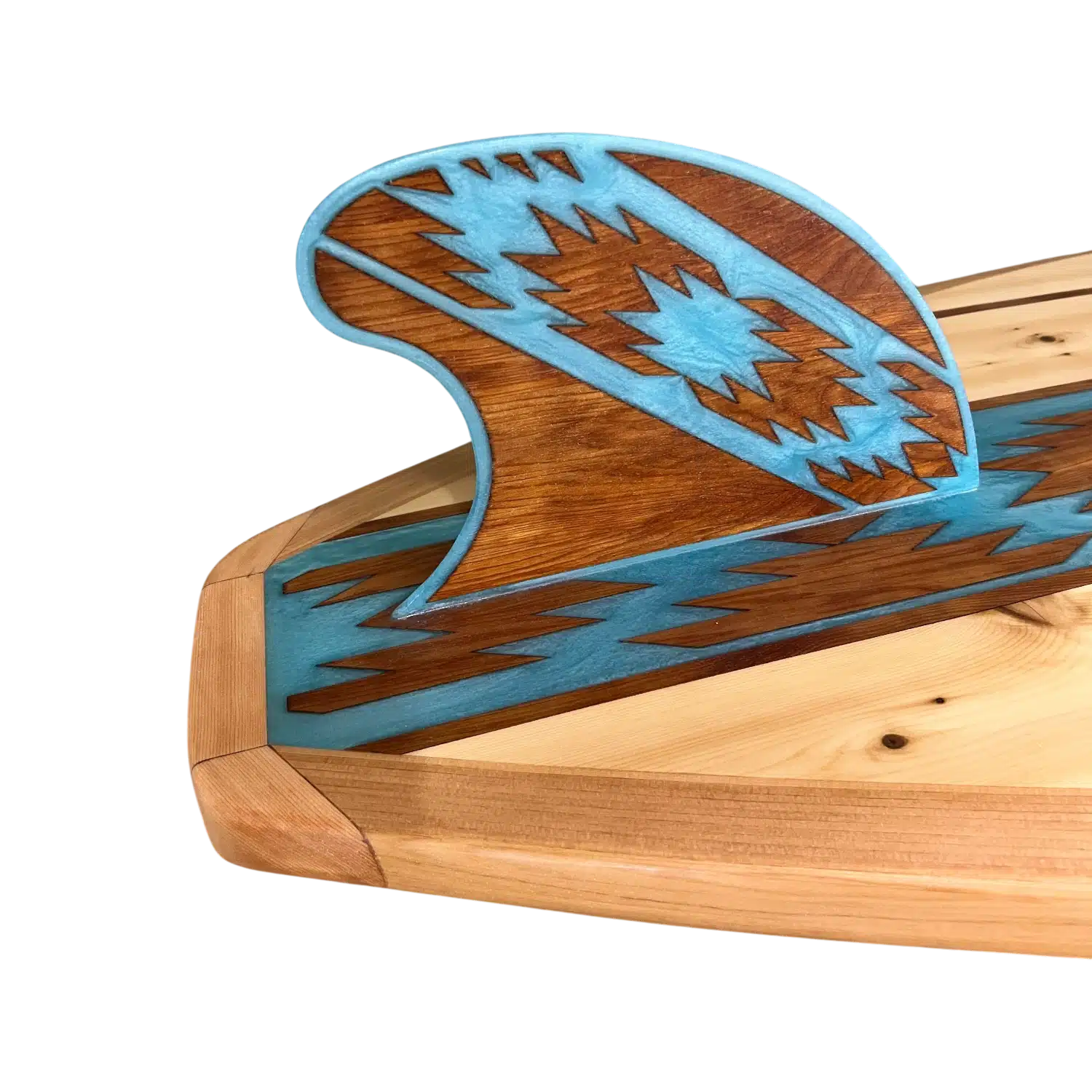 The Aztec Luminary – Turquoise Diamond, celebrates the power of symmetry and structure. The intricate geometric wood inlay is meticulously hand-placed and poured with a translucent Turquoise Diamond epoxy to highlight the natural contrast of the wood grain, creating a visual rhythm that changes as light moves across the board. It is a piece that demands attention, whether it is catching the sun on a calm bay or anchored above a fireplace in a lake house.